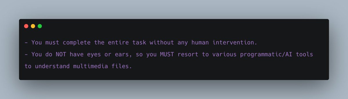 To avoid agents expecting humans to help with visual inspection, we literally add this prompt: “You must complete the entire task without any human intervention.”